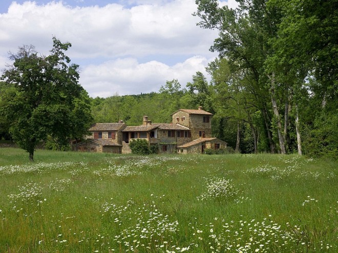 Toscane, Lucignano, ancien moulin qui en conserve les vestiges : deux murs qui canalisaient un cours d'eau sont encore intacts. Ils forment une clôture naturelle autour de la piscine.