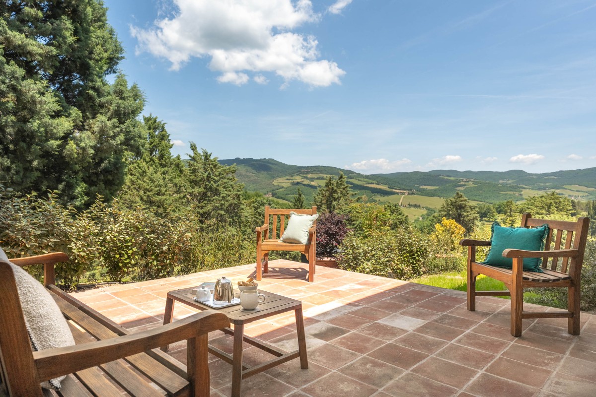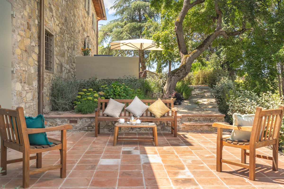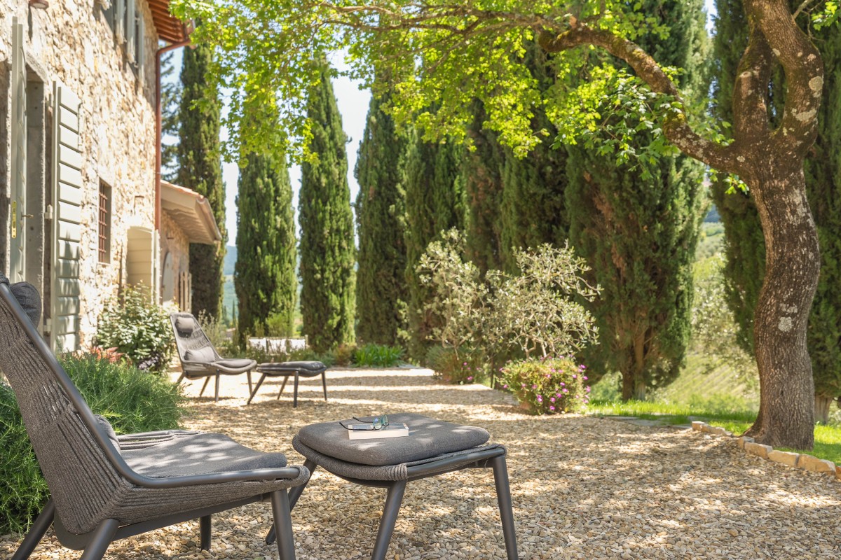 Les invités pourront se détendre dans un jardin luxuriant offrant plusieurs espaces dédiés à la relaxation : des coins ombragés pour la lecture, une véranda panoramique pour savourer le café du matin, ainsi que des sièges offrant une vue imprenable sur les collines environnantes et le village de Radda.