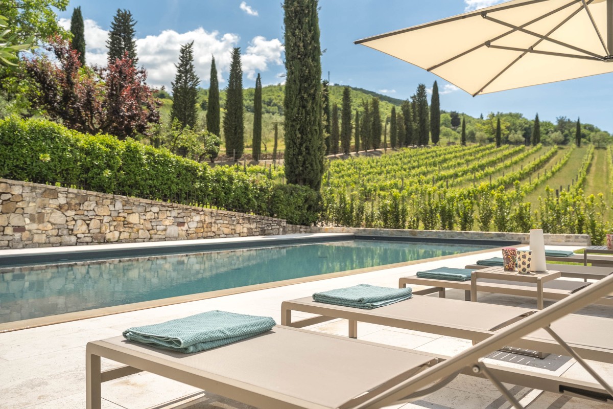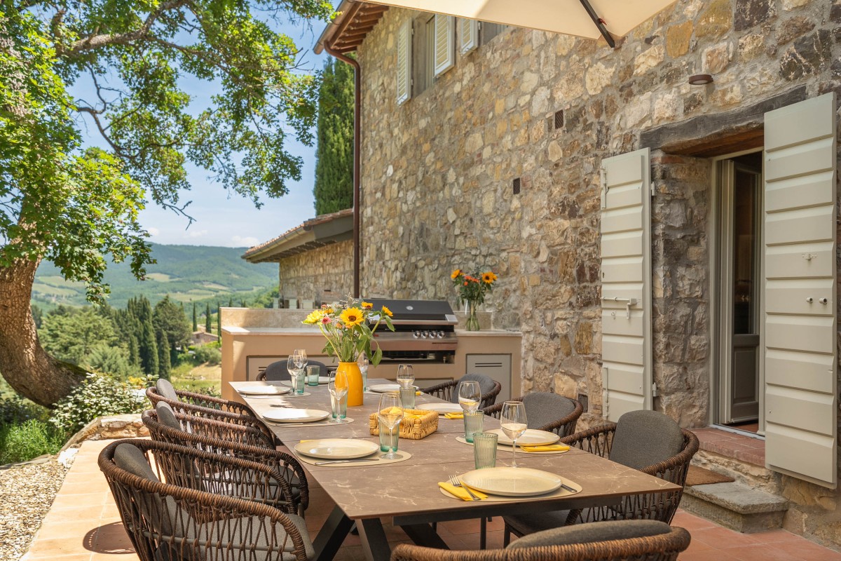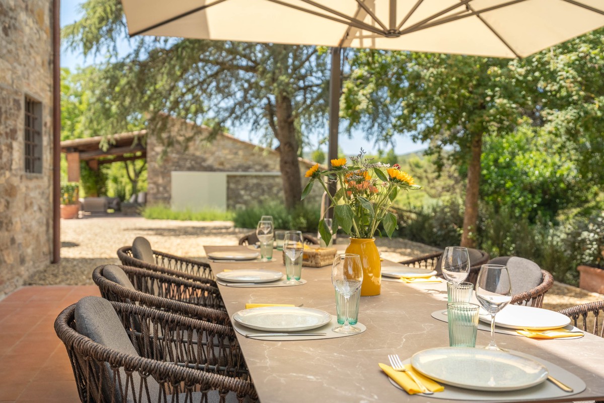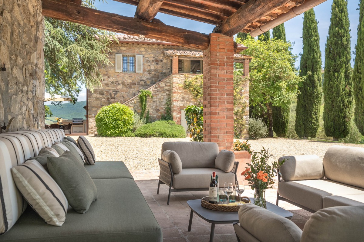 Les invités pourront se détendre dans un jardin luxuriant offrant plusieurs espaces dédiés à la relaxation : des coins ombragés pour la lecture, une véranda panoramique pour savourer le café du matin, ainsi que des sièges offrant une vue imprenable sur les collines environnantes et le village de Radda.