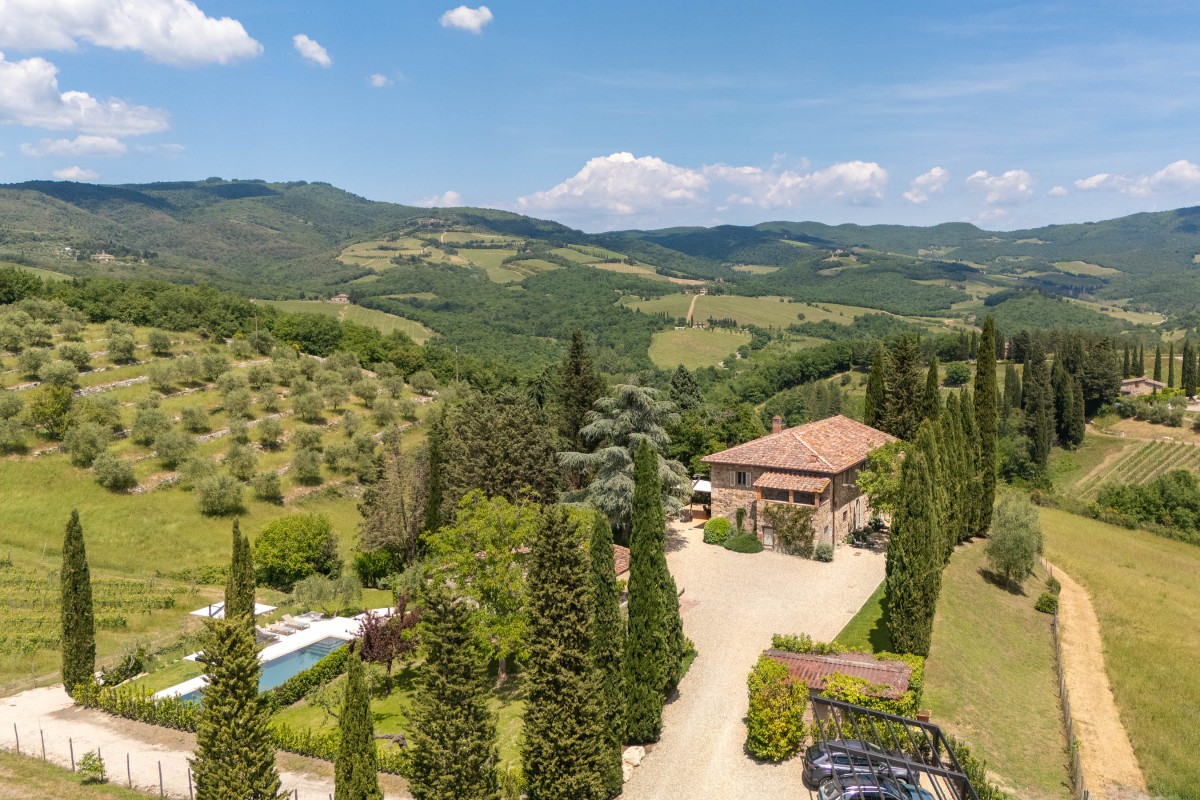 Radda in Chianti, découvrez une splendide ferme en pierre, dotée d'une piscine privée, située à seulement un kilomètre du charmant village de Radda in Chianti, accessible à pied.