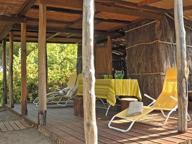 Près de la plage, cabane pour pique-nique avec frigo, douche, transats, table et chaises.