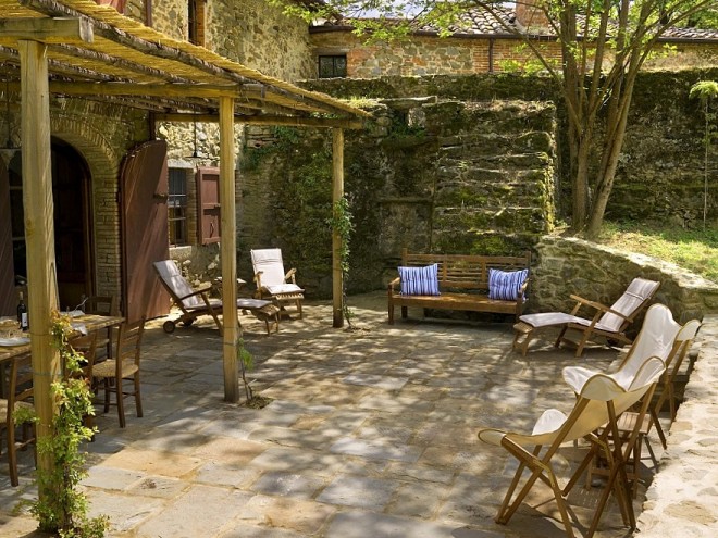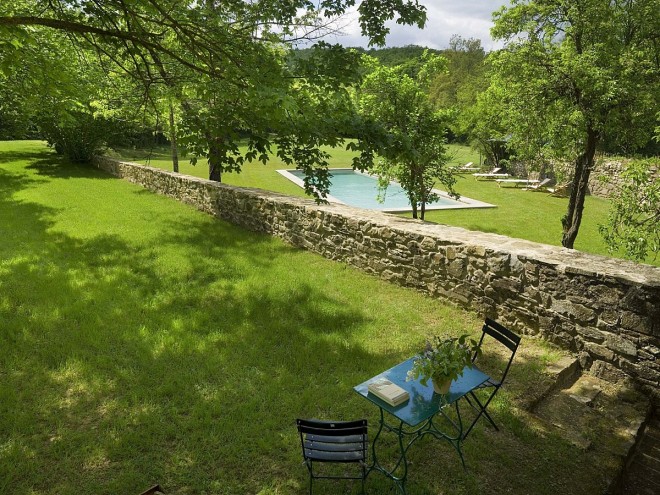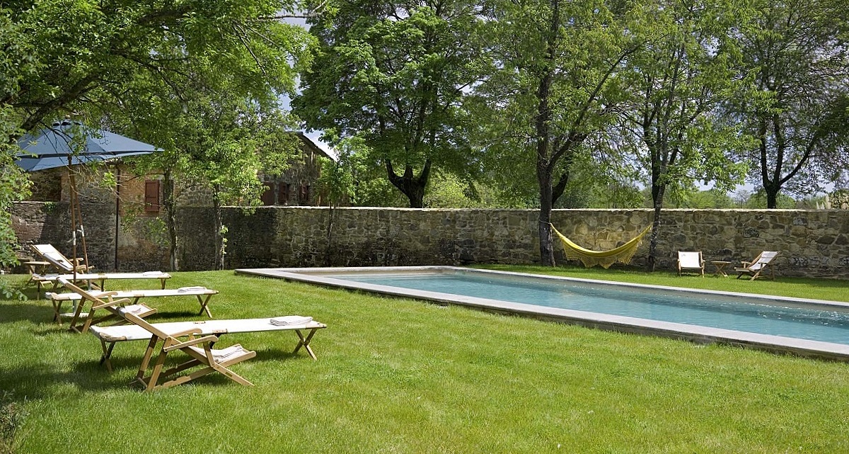 Toscane, Lucignano, ancien moulin qui en conserve les vestiges : deux murs qui canalisaient un cours d'eau sont encore intacts. Ils forment une clôture naturelle autour de la piscine.